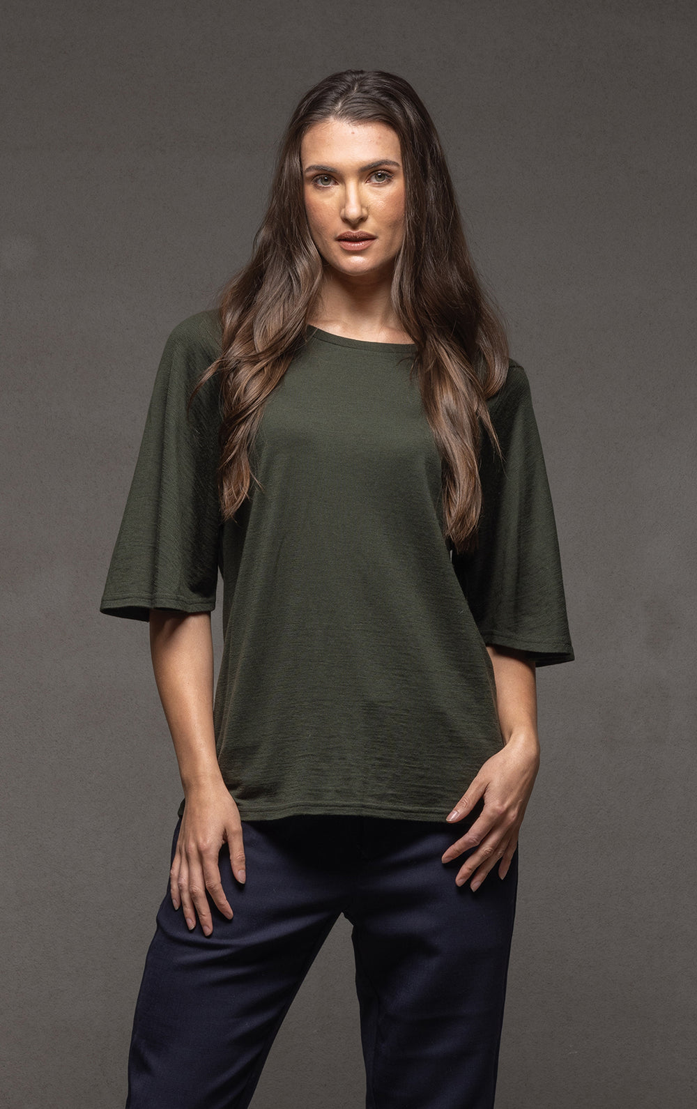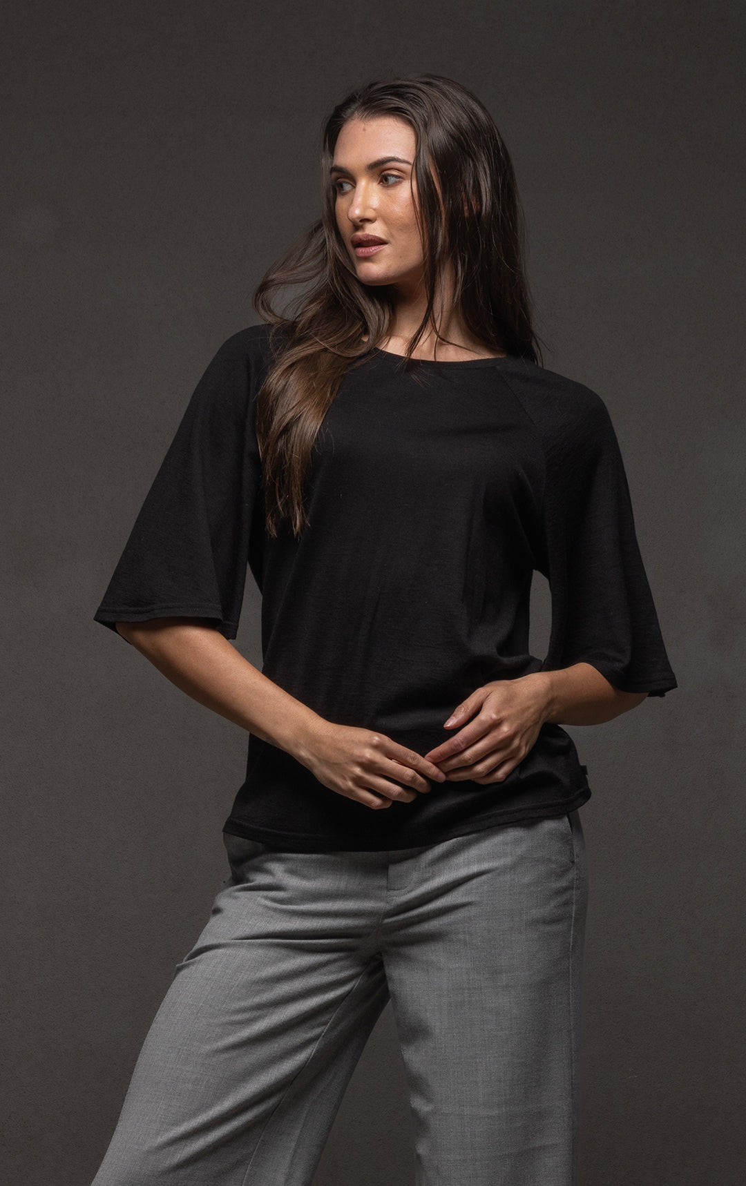 Made from 100% Merino Wool, this Flutter Tee offers something a little different than your typical merino shirt- a feminine modern silhouette with statement sleeves.