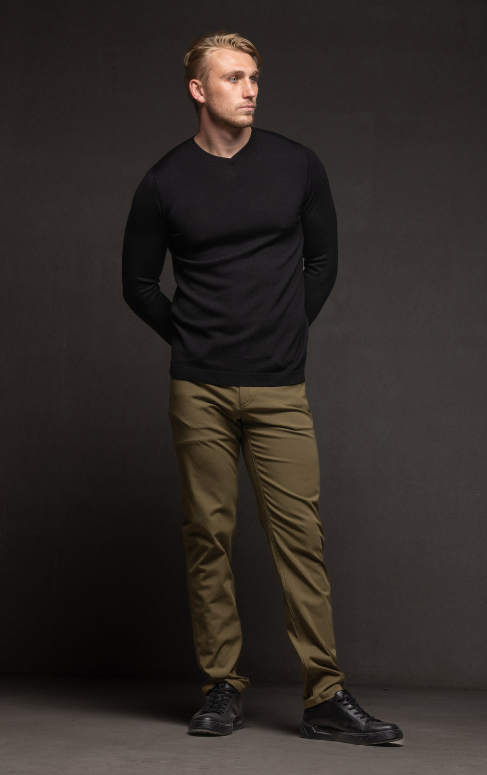 A midweight menswear staple piece with enough attention to detail to exceed your expectations. Here a machine washable extra fine pure merino is knitted into a pill resistant, 12 gauge, semi-fitted v-neck style with fully fashion detail on shoulder and ribbed detail at hem and cuffs.