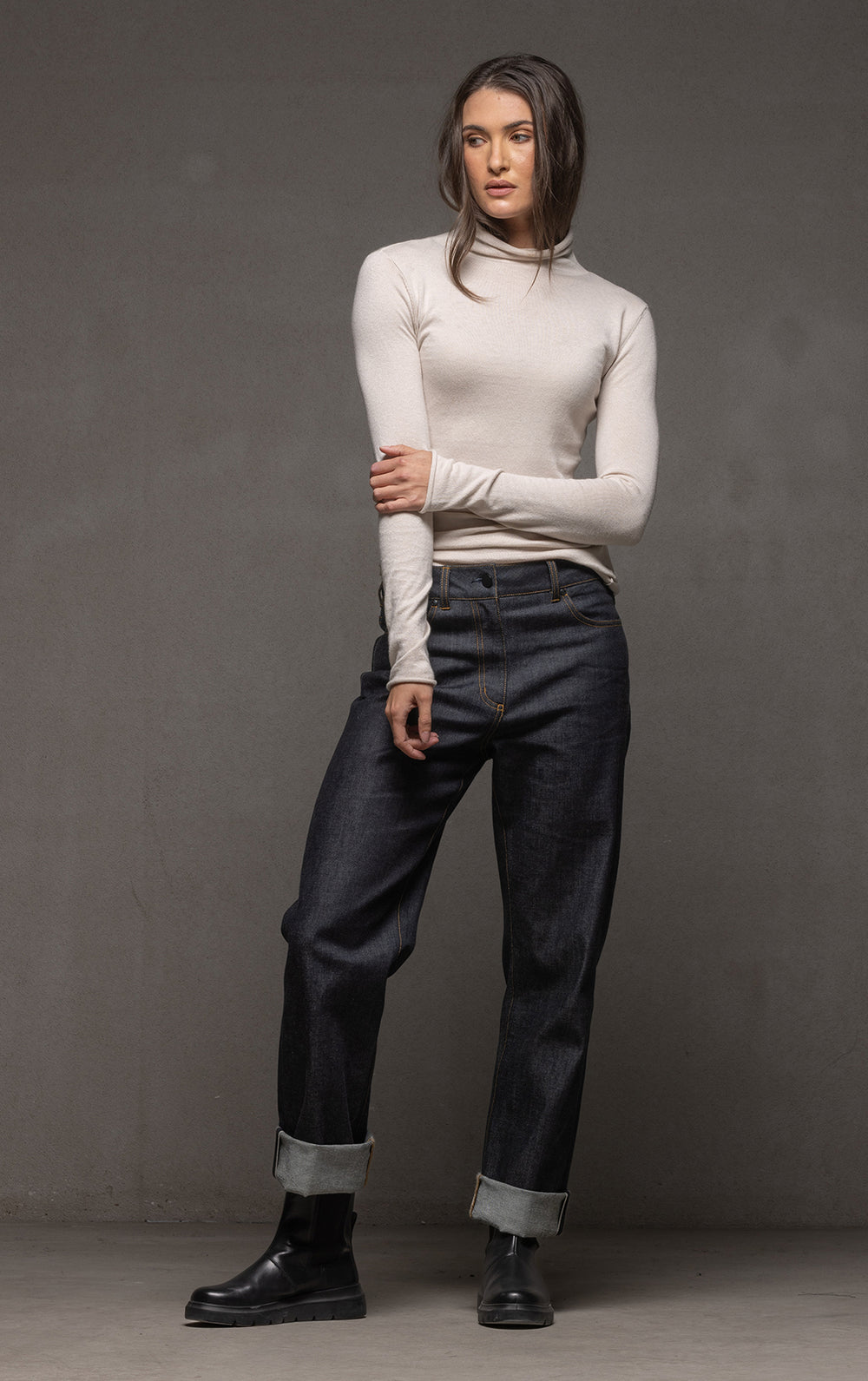 Another elevated basic for your wardrobe. The Cotton Silk Turtleneck is built with a super soft blended cotton/silk yarn, then reinforced with nylon to create a lovely, soft, next-to-skin piece worn on it's own or as a foundation layer. An instant favourite with our staff already.