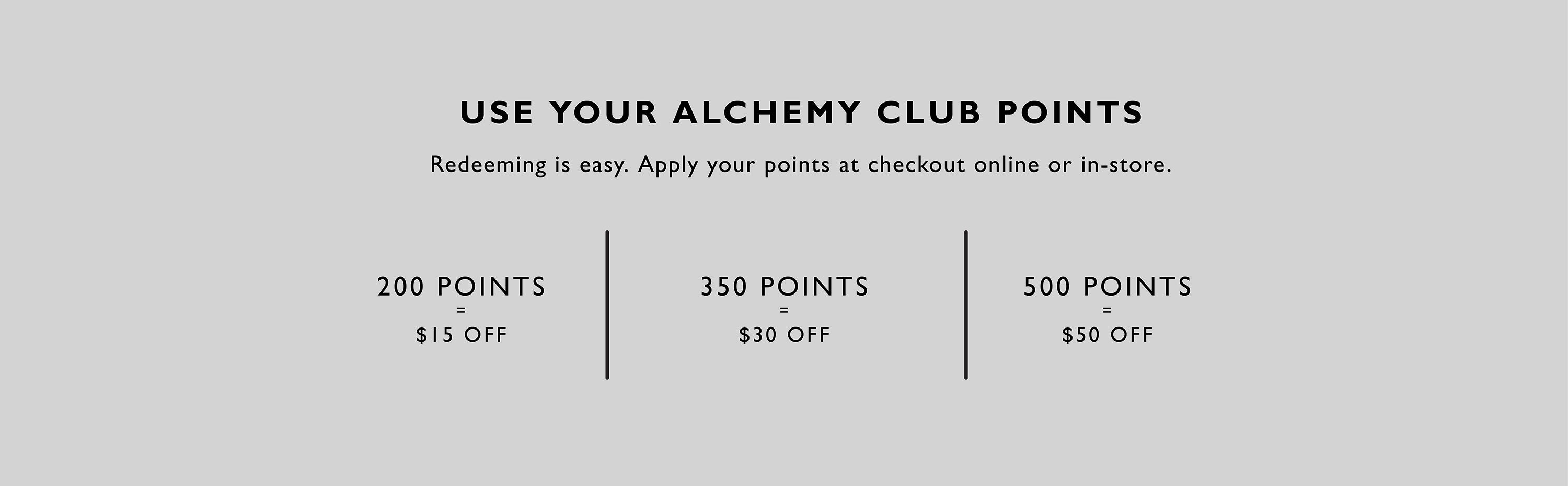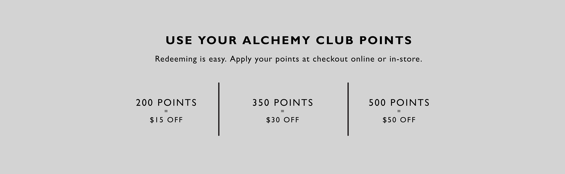 To check your rewards balance or redeem rewards points for a coupon code, simply click the 'ALCHEMY CLUB' tab that pops up at the bottom-left of our site and login.
